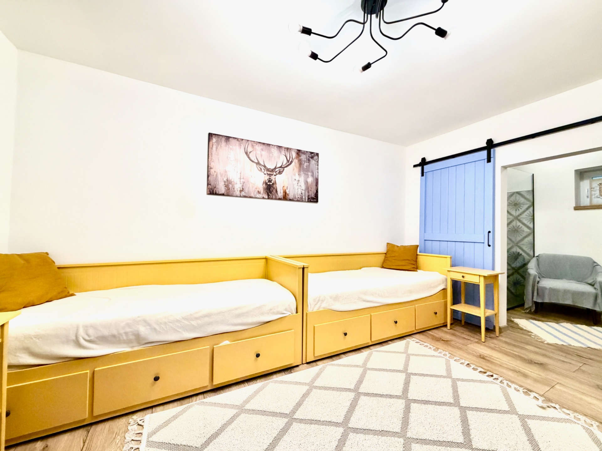 Barátságos lakrész négy fő részére, egy hálószobával, amelyben két kihúzható ágy található, valamint saját fürdőszobával. Ideális családoknak vagy kisebb baráti társaságoknak. A közös, teljesen felszerelt konyhát és étkezőt a másik apartmannal megosztva lehet használni – kiváló hely egy közös reggelihez vagy esti beszélgetéshez. A ház csendes, meghitt hangulata garantálja a pihentető kikapcsolódást.